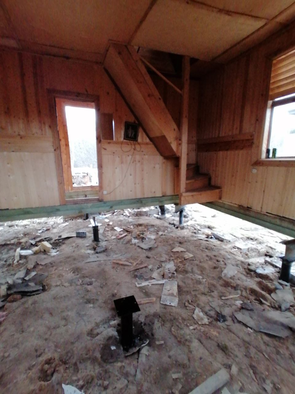 Монтаж винтовых свай в нутри дома со вскрытием полов и заменой венцов.