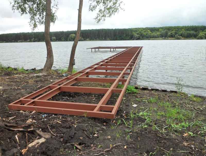 Как выглядит процедура изготовления таких наводных конструкций? Мастера приезжают на замер, уточняют индивидуальные особенности водоема и близлежащих построек, согласовывают с заказчиком сроки производственных и монтажных работ, заключают договор.